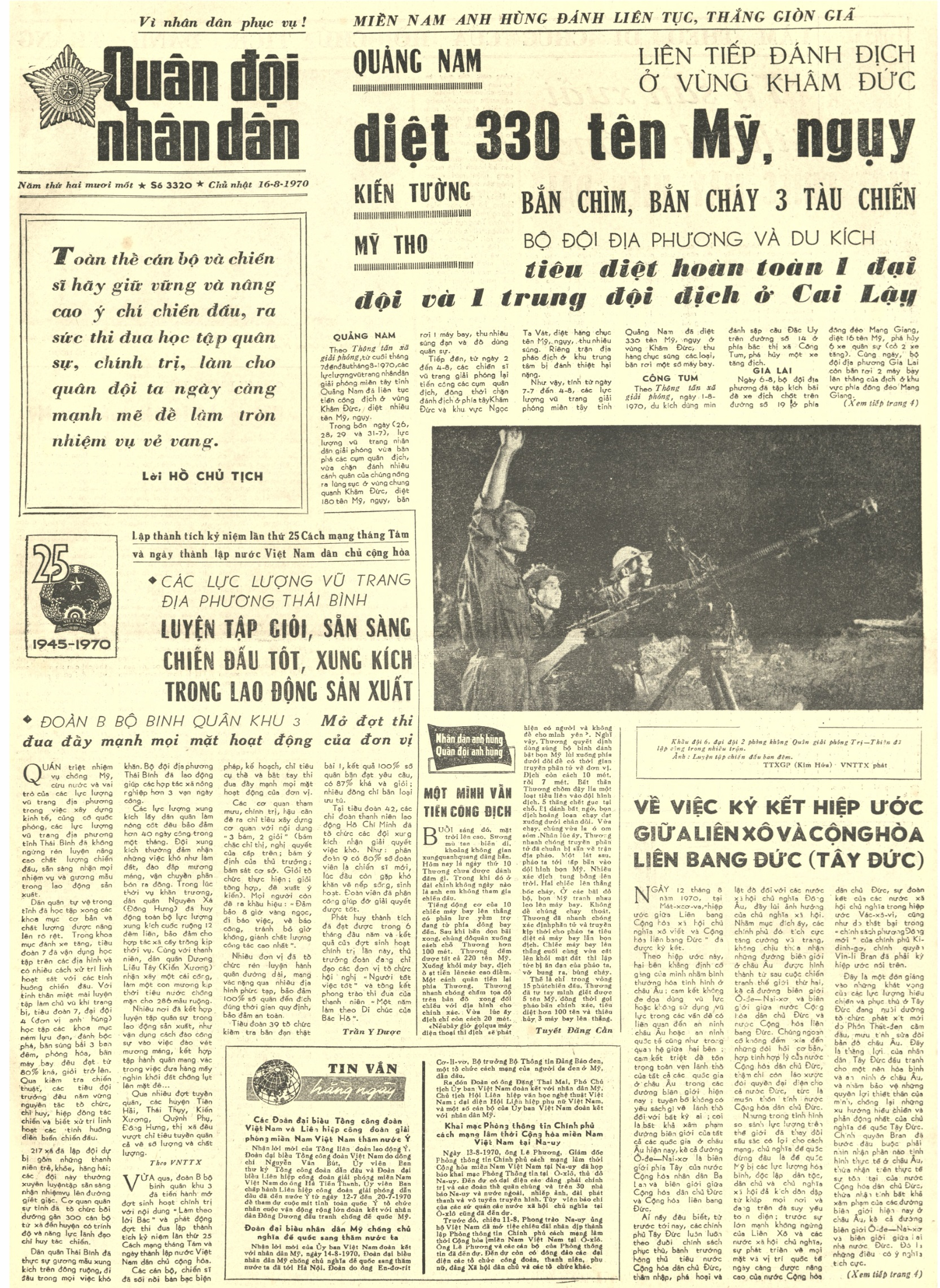 Trên trang nhất Báo Quân đội nhân dân số 3320 ngày 16-8-1970 đã đăng tải lời kêu gọi của Chủ tịch Hồ Chí Minh đến toàn thể cán bộ và chiến sĩ với nội dung sau: "Toàn thể cán bộ và chiến sĩ hãy giữ vững và nâng cao ý chí chiến đấu, ra sức thi đua học tập quân sự, chính trị, làm cho quân đội ta ngày càng mạnh mẽ để làm tròn nhiệm vụ vẻ vang".