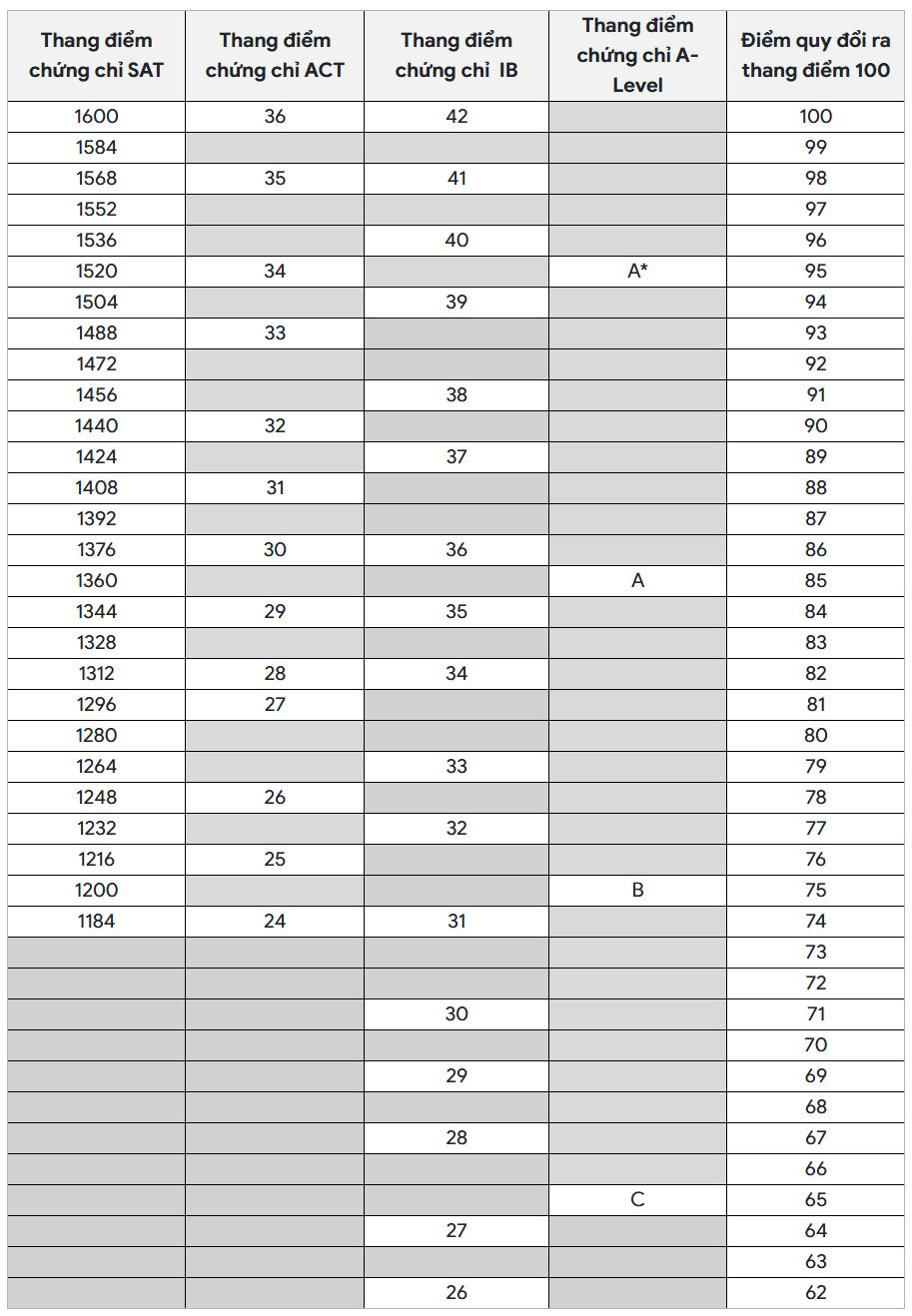 Về nguyên tắc quy đổi điểm giữa các chứng chỉ tuyển sinh quốc tế trong bảng trên: