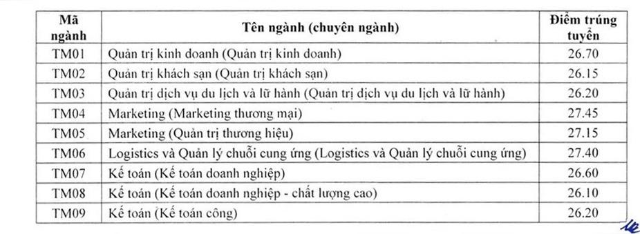 - Theo đó, khoa Marketing (Marketing thương mại) có điểm chuẩn trúng tuyển cao nhất (27,45 điểm). Thấp nhất là Khoa quản trị dịch vụ du lịch và lữ hành với điểm chuẩn là 26,2 điểm.