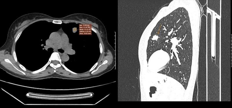 Tuy nhiên, kết quả chụp cắt lớp vi tính (CT) lồng ngực có tiêm thuốc cản quang đã phát hiện một nốt đặc kích thước 21x14mm có bờ tua gai ở thùy trên phổi trái, hình ảnh gợi ý khối u ác tính.