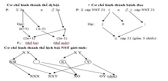 Cơ chế : Sự không phân li của một hay một số cặp NST trong giảm phân tạo ra các loại giao tử thừa hay thiếu một vài NST. Các loại giao tử này kết hợp với giao tử bình thường sẽ tạo ra các thể lệch bội.