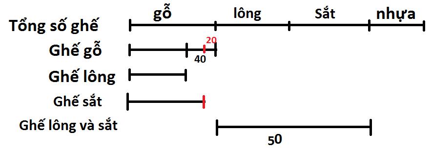 Như vậy, ta dễ dàng thấy được, nếu ta lấy hiệu giữa số ghế gỗ và ghê lông, cộng với tổng số ghế lông và ghế sắt, ta sẽ được tổng giữa ghế gỗ và ghế sắt. Từ đó, áp dụng công thức tổng hiệu tính được số ghế gỗ và ghế sắt. Dễ dàng tính được số ghế lông dựa theo số ghế sắt. Lấy tổng số các ghế trừ đi số ghế gỗ, lông, sắt, ta sẽ được số ghế nhựa trong khán đài.